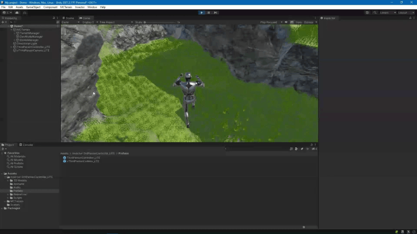 Once MC Terrain is running, the first thing to do it to replace the TempPlayer GameObject with a fully featured Player Controller. You can use either Third Person or First Person Controllers.
